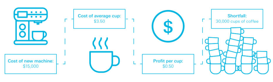 Take the example of a suburban coffee shop where the average price for a cup of coffee is $3.50. The operator’s coffee machine breaks down one day and needs to be replaced. To maintain productivity, the operator needs to purchase a new coffee machine priced at $15,000 straight away.